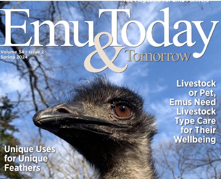 The Spring 2024 Issue of ET&T highlights include “Unique Uses for Unique Feathers,” “Livestock or Pet, Emus Need Livestock Type Care for Their Wellbeing,” “Emu in the Classroom: A Guide to Creating a School Hatching Project,” “Easy Emu Recipes: Emu Sausage Bread and Quick Based Pasta Family Style,” “Once an Emu Farmer Always an Emu Farmer,” “To Worm or Not to Worm, That is the Question,” and “Roadside Farm Signs.”