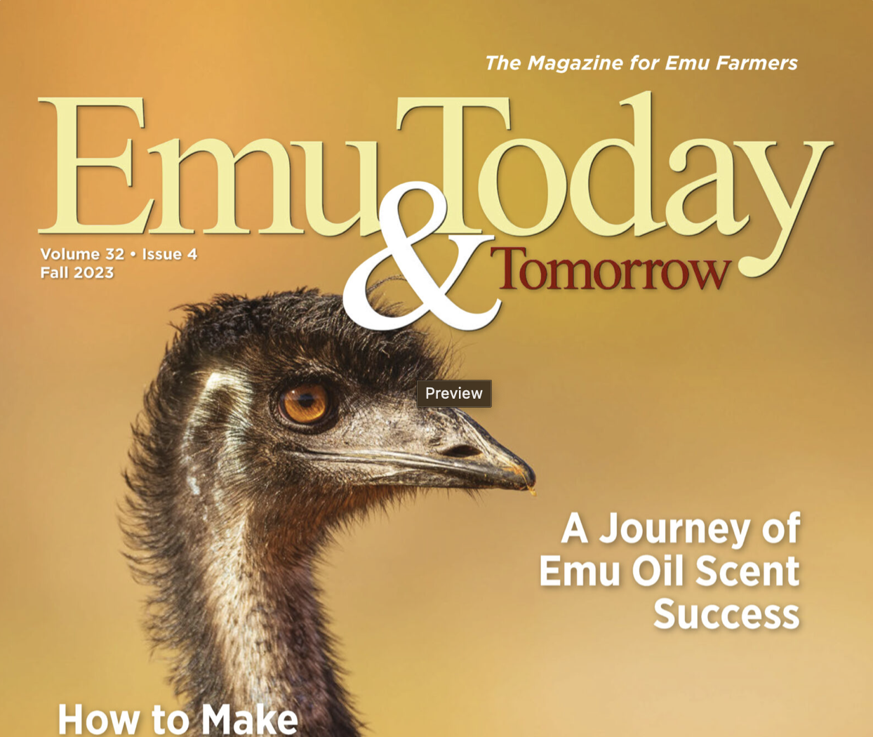 The Fall 2023 Issue of ET&T highlights include “A Journey of Emu Oil Scent Success,” “Guidelines for Handling and Storage of Emu Fat,” “How to Make Emu Oil Soap: Instructions for ‘Cold Process Soap,’” “What Does the Modernization of Cosmetics Regulation Act of 2022 Mean for Emu Farmers,” “Ready to Hatch—Good Hygiene Will Reduce Chick Deaths,” “Getting Ready for Winter,” and “Scarecrows: A Simple Solution to an Old Problem.”